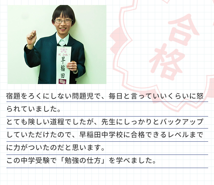 宿題を全くやらない息子を本当に熱心にご指導いただき、最後には「受験生」にしていただきました。