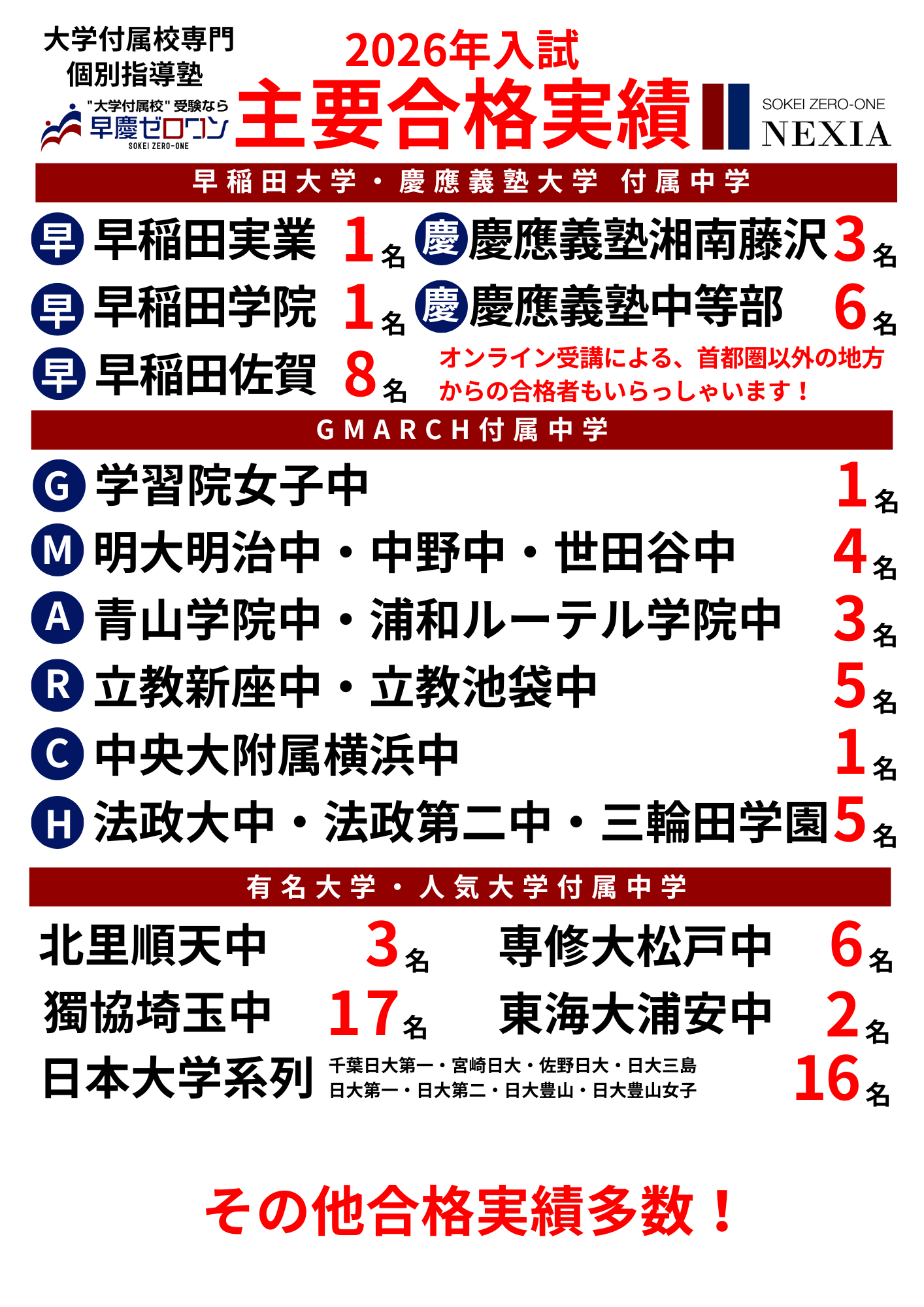 | 連絡先 | TEL 03-6384-1076 zeroone-yotsuya@chugaku-juken.co.jp |