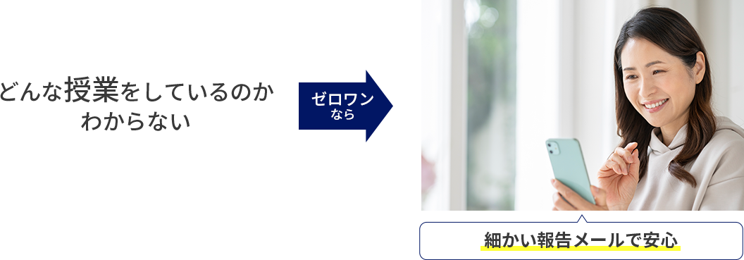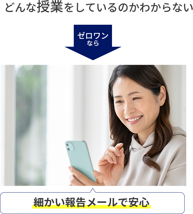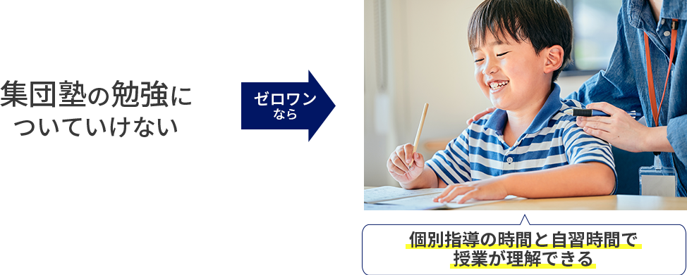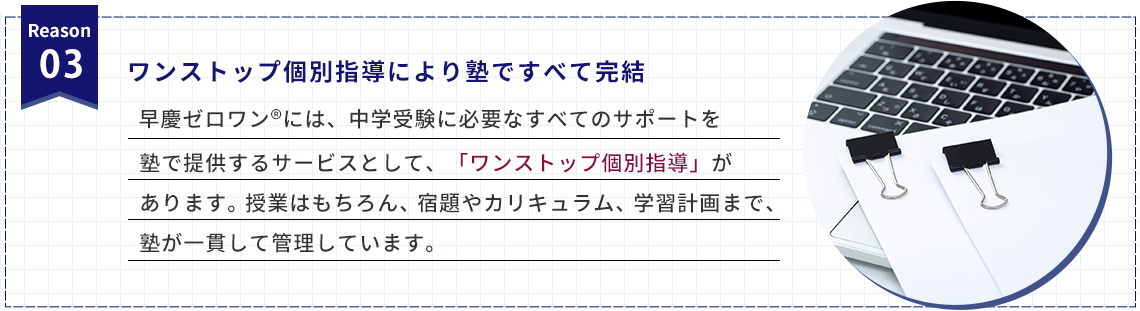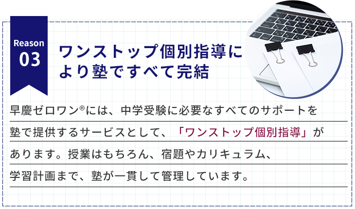 そのため、親御様の時間やストレスを大幅に削減し、「ケンカしない中学受験」を実現します。ワンストップ個別指導は早慶ゼロワンだけのサービスです。