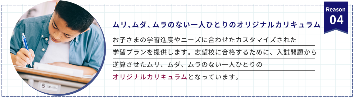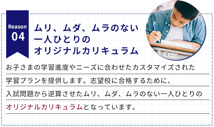 しかも「ワンストップ個別指導」により、 授業はもちろん、宿題やカリキュラム、 学習計画まで、塾が一貫して管理するサービスが含まれています。中学受験を課金ゲームにしません!
