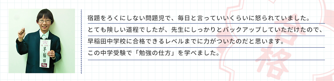 宿題を全くやらない息子を本当に熱心にご指導いただき、最後には「受験生」にしていただきました。