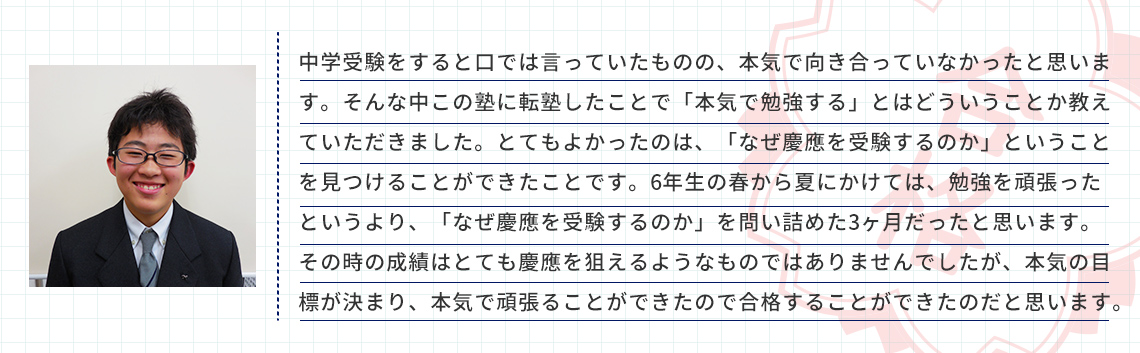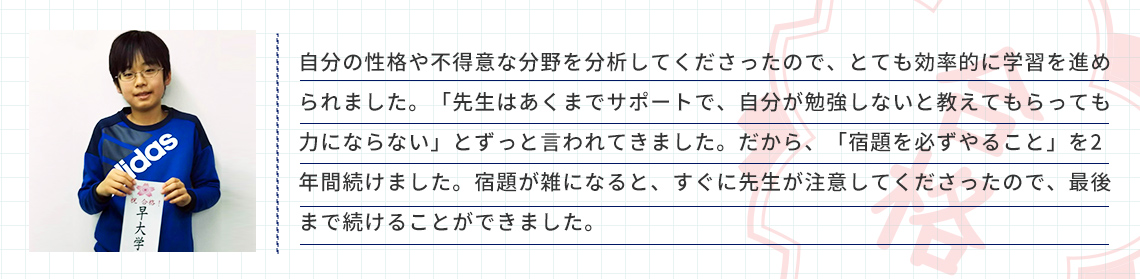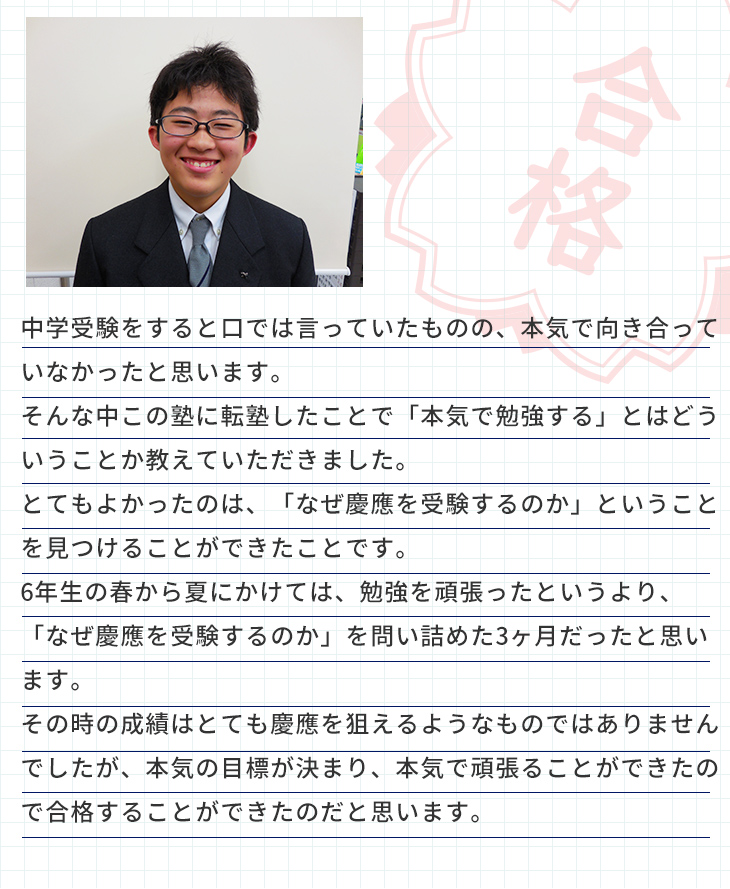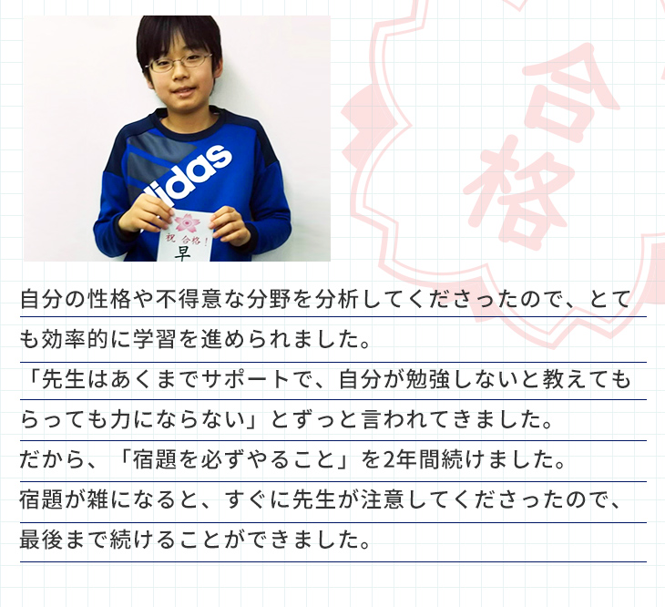 器用な性格ではない息子ですが、先生は一生懸命さを褒めてくださり、自信をもって受験に臨むことができました。