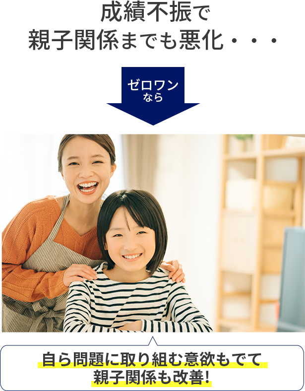 集団塾に通っているときは授業や宿題に追いつくことができず、成績不振で悪循環に陥っていました。結果、親子仲が悪くなってしまうこともありました。早慶ゼロワン®には、個別指導で中学受験を完結できるという点で思い切って塾を変えました。転塾してからは、見違えるほど本人のやる気につながり、解くこと解けることの楽しみに気づくことができるようになりました。苦手意識もなくなり、自ら問題に取り組む意欲につながっています。家で親が勉強の面倒を見る必要もなくなり、改めて良い親子関係になりました。(小5塾生のお母さまより)